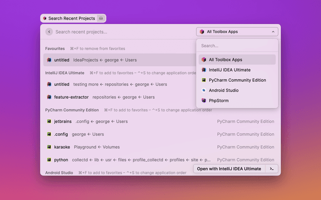 Search and open JetBrains Toolbox projects