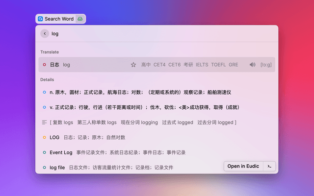 • Support to open the Eudic Application and quickly look up words, if installed on your Mac.