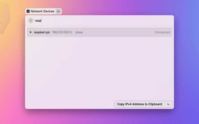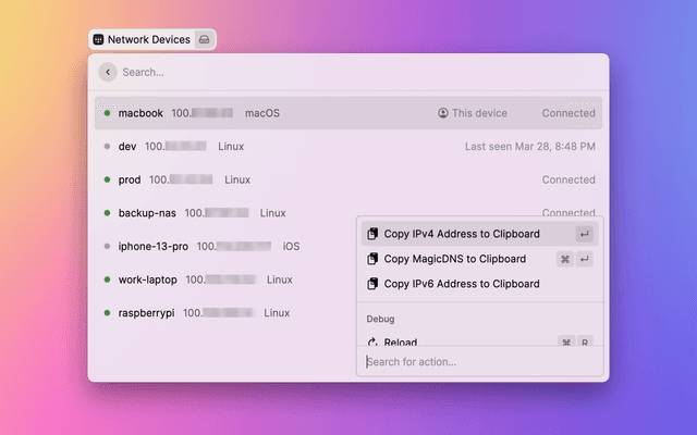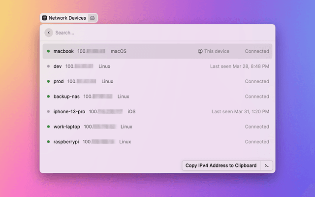 List devices in your Tailnet and copy the IPv4, IPv6, or MagicDNS address to your clipboard.